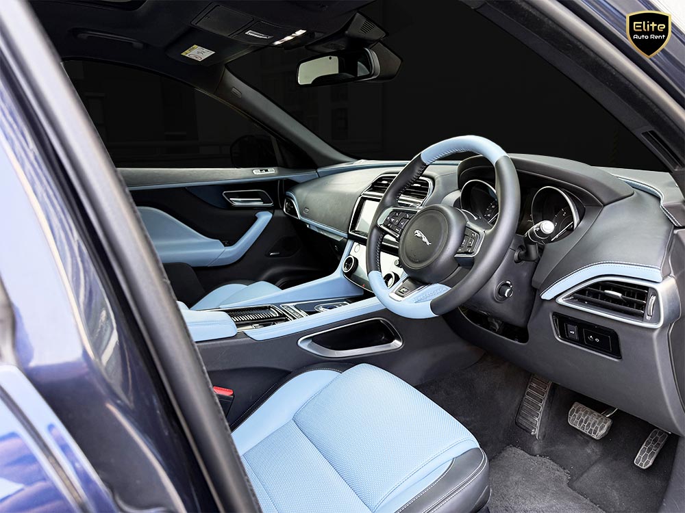 Experience a new level of style and performance when you rent the Jaguar F-Pace R-Sport in Bangkok. With its sleek deep blue exterior and rare two-tone blue-and-black interior, this luxury SUV blends British design excellence with sporty power.